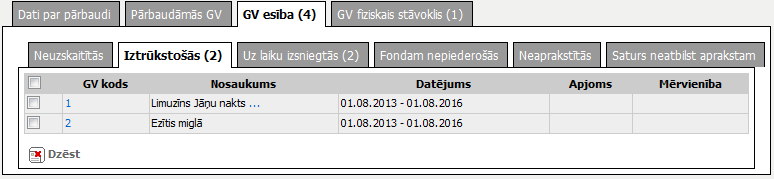 Tabula ar glabājamām vienībām, kuras esības un fiziskā stāvokļa pārbaudes laikā konstatētas kā iztrūkstošas, t.i., šķirklī ‘Pārbaudāmās GV’ norādīta GV esība ‘Iztrūkstoša’. |