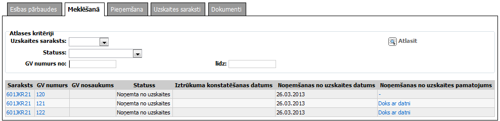 Noklikšķinot tiek meklētas glabājamās vienības, kas atbilst blokā ‘Atlases kritēriji’ norādītajiem kritērijiem. |