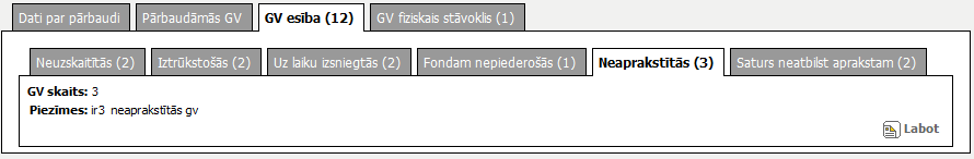 Noklikšķinot atver neaprakstīto glabājamo vienību datus – skaitu un piezīmes (skat. aprakstu 16.3.3.6. Uznirstošais logs: Neaprakstīto glabājamo vienību datu labošana). |