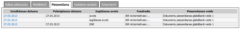 Apakššķirklis „Pieņemšana” paredzēts informācijas attēlošanai par fonda dokumentu pieņemšanu.