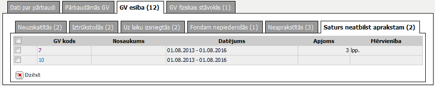 Tabula glabājamām vienībām, kurām esības un fiziskā stāvokļa pārbaudes laikā konstatēts, ka saturs neatbilst apraktam, t.i., šķirklī ‘Pārbaudāmās GV’ norādīta GV esība ‘Saturs neatbilst aprakstam’. |
