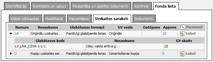 Tabulā tiek attēloti visi fonda uzskaites saraksti |