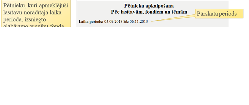 Lai izveidotu atskaiti ‘Pētnieku apkalpošana - Pēc lasītavām, fondiem un tēmām’, kurā attēlo informāciju par lasītavās izsniegto glabājamo vienību fondiem pētnieku pētāmo tēmu ietveros periodā, par kuru reģistrēti apmeklējumi: