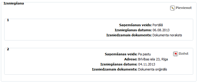 Bloks „Izsniegšana” paredzēts pieprasījuma saņemšanas/izsniegšanas kanālu attēlošanai.