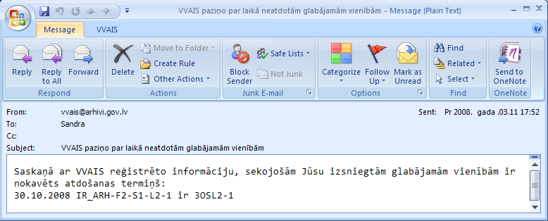 − Saturs – " Saskaņā ar VVAIS reģistrēto informāciju, sekojošām Jūsu izsniegtām glabājamām vienībām ir nokavēts atdošanas termiņš:", zem teksta saraksta veidā tiek attēlotas šī sistēmas lietotāja izsniegtās glabājamās vienības uzziņu kodu un glabājamās vienības nosaukumu. Glabājamo vienību ieraksti e-pastā ir kārtoti pēc plānotā atdošanas datuma un glabājamās vienības uzziņu koda.