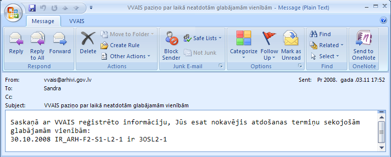 Saturs – " Saskaņā ar VVAIS reģistrēto informāciju, Jūs esat nokavējis atdošanas termiņu sekojošām glabājamām vienībām:", zem teksta saraksta veidā tiek attēlotas šim sistēmas lietotājam izsniegtās glabājamās vienības uzziņu kodu un glabājamās vienības nosaukumu. Glabājamo vienību ieraksti e-pastā ir kārtoti pēc plānotā atdošanas datuma un glabājamās vienības uzziņu koda.