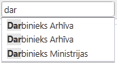 Teksta ievades lauks ar automātisko papildināšanu. Lai lietotājam būtu vieglāk ievadīt datus par objektiem, kas definēti sistēmā, piem., fizisko personu vārdus, logos pieejami teksta ievades lauki, kur teksts tiek aizpildīts automātiski ievadot pirmos burtus (skat. aprakstu 2.10.3Datu ievade ar automātisko papildināšanu). |