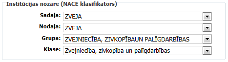 Izvēloties vērtību no hierarhiska klasifikatoru saraksta, tiek parādīts nākamais papildlauks ar nākamā līmeņa klasifikatoru vērtībām izkrītošā sarakstā (skat aprakstu 2.10.2. Lauka aizpilde no hierarhiska klasifikatora). |