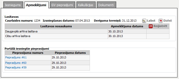 Šķirklis „Apmeklējumi” paredzēts pētnieka caurlaides lasītavā informācijas pievienošanai, labošanai un apskatei, apmeklējumu reģistrēšanai un portālā iesniegto pētnieka pieprasījumu lasītavā informācijas attēlošanai.