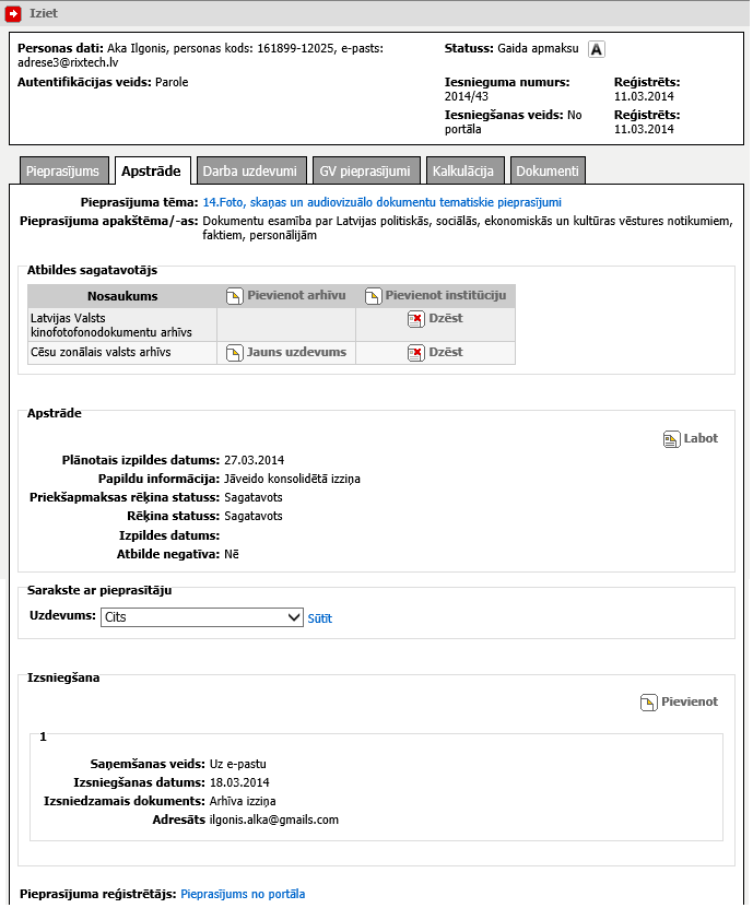 − Informācijas par izsniedzamo dokumentu (saņemšanas veids, izsniegšanas/nosūtīšanas datums, izsniedzamā dokumenta veids) norādīšana.