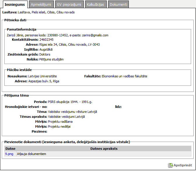 Šķirklis „Iesniegums” paredzēts pētnieka iesnieguma informācijas apskatei un precizēšanai (pētījuma tēmas, mērķa un perioda norādīšanai), ja iesniegums nav reģistrēts iekšējā portālā un nav apstiprināts vai noraidīts. Ja iesniegums reģistrēts iekšējā portālā, iesnieguma informācija ir pieejama apskatei.