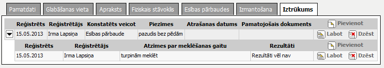 Tabulā par katru glabājamās vienības iztrūkumu attēlo vienu rindu, zem katras rindas ir izvēršama apakštabula ‘Meklēšanas darbības’. Ja iztrūkumam nav statuss ‘Novērsts’ vai iztrūkumam ir piereģistrēta meklēšanas darbība, tad tabulas rindas sākumā tiek attēlota "+" zīme, ko izmanto, lai izvērstu apakštabulu ‘Meklēšanas darbības’. Ja apakštabula ‘Meklēšanas darbības’ ir izvērsta, tabulas rindas sākumā tiek attēlota "-" zīme, ko izmanto, lai apakštabulu. |