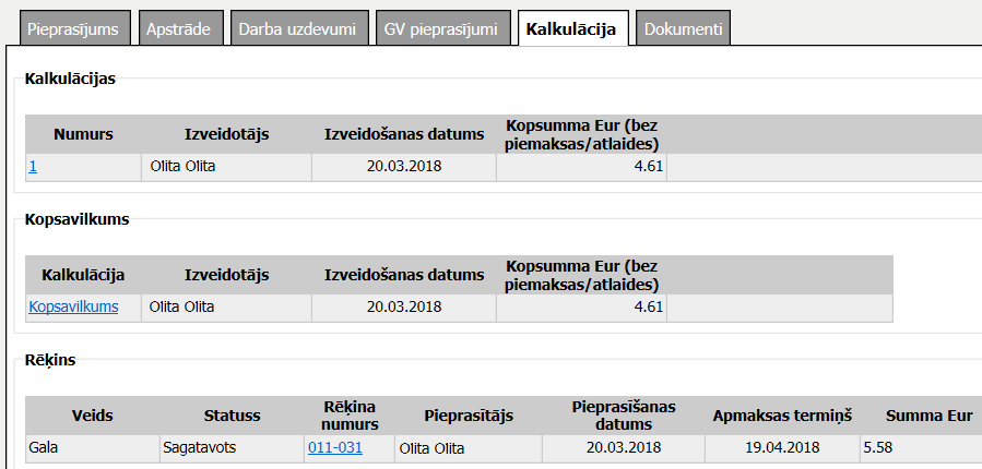 Šķirklis „Kalkulācija” (Papīra dokumenta kopijas pieprasījuma gadījumā šķirklim nosaukums ir ‘Rēķins’) paredzēts pieprasījumam piesaistīto kalkulāciju un rēķinu apskatei un uzturēšanai.