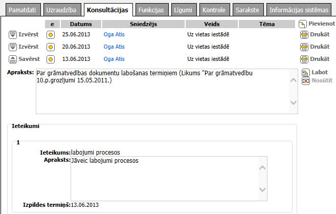 Noklikšķinot ieraksts tiek parādīts izvērstā skatā. Tiek parādīts papildu lauks Apraksts un bloks Ieteikumi, kā arī darbības [Labot] un [Nosūtīt]. |