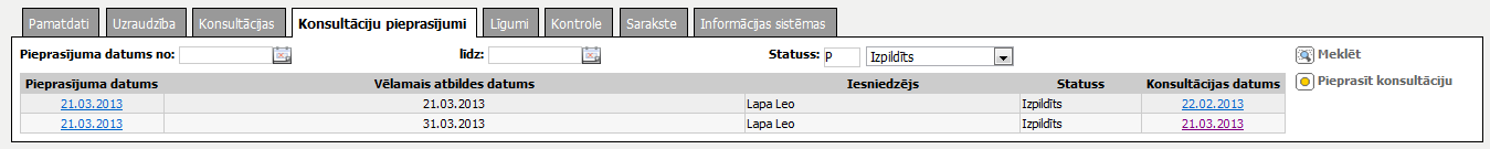 Konsultācijas pieprasīšanas datums. Hipersaite, kuru noklikšķinot tiek atvērts konsultācijas apskates logs (skat. aprakstu 4.4 Logs: Konsultācijas pieprasījums). |
