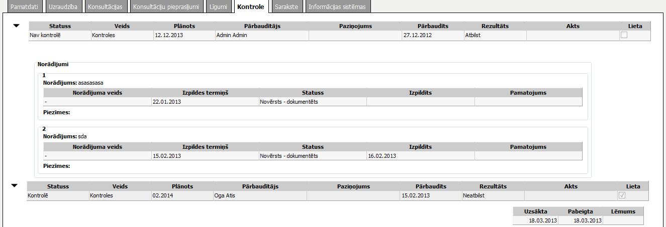 Loga ‘Uzraudzības iestāde’ šķirklis ‘Kontrole’ paredzēts uzraudzības iestādes pārbaužu datu apskatei. Par katru uzraudzības iestādes pārbaudi attēlo pārbaudes informāciju un tad norādījumus.