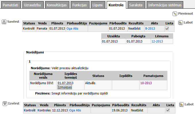 Noklikšķinot ieraksts tiek parādīts izvērstā skatā. Pārbaudei, par kuru ir ierosināta administratīvā lieta tiek parādīti papildu lauki Uzsākta, Pabeigta un Lēmums. Katram norādījumam tiek parādīti papildu lauki Norādījums, Izpildīts, Pamatojums un Piezīmes. |