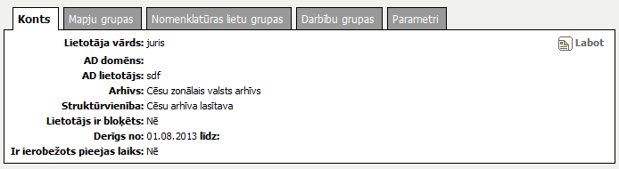Lietotājam norādītais AD lietotājs– vērtība tiek attēlota, ja lietotājs ir arhīva darbinieks. |