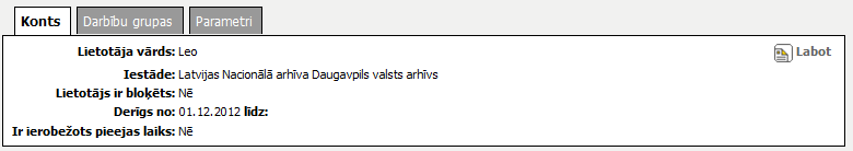 Lietotāja arhīvs– vērtība tiek attēlota, ja lietotājs ir arhīva darbinieks. |
