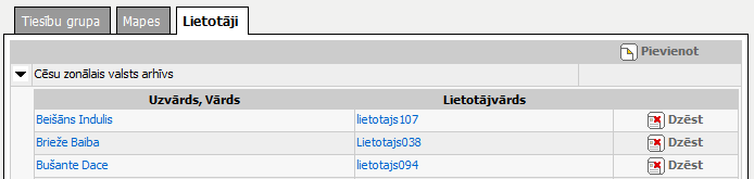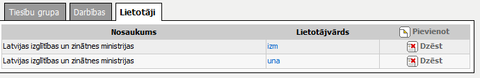 Šķirklis „Lietotāji” paredzēts tiesību grupā tiesību grupā iekļauto lietotāju apskatei, jaunu pievienošanai vai esošu noņemšanai.