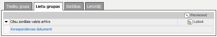 Šķirklis „Lietu grupas” paredzēts tiesību grupā iekļauto nomenklatūras lietu apskatei, jaunu pievienošanai vai esošu noņemšanai. Šķirklis pieejams, ja tiesību grupas veids ir ‘Lietvedības mapju’.