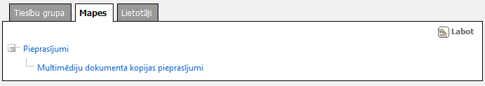 Šķirklis „Mapes” paredzēts tiesību grupā iekļauto mapju apskatei, jaunu pievienošanai vai esošu noņemšanai. Šķirklis pieejams, ja tiesību grupas veids ir ‘Mapju’.