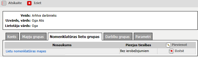 Noklikšķinot lietotājam pievienotā nomenklatūras mapju tiesību grupa tiek dzēsta. |