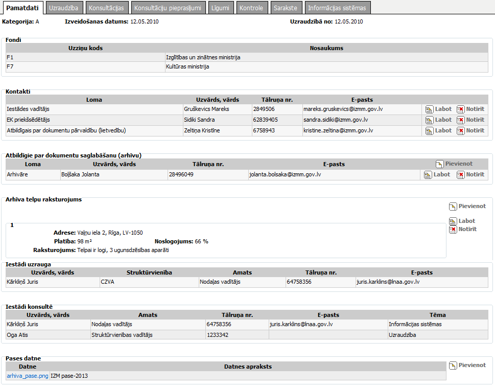 − Pamatinformācijas (kategorijas, izveidošanas datuma, kontaktpersonu un atbildīgo par dokumentu saglabāšanu kontaktinformācijas, arhīva telpu raksturojuma, atbildīgo Latvijas Nacionālā arhīva darbinieku kontaktinformācijas) apskatei;