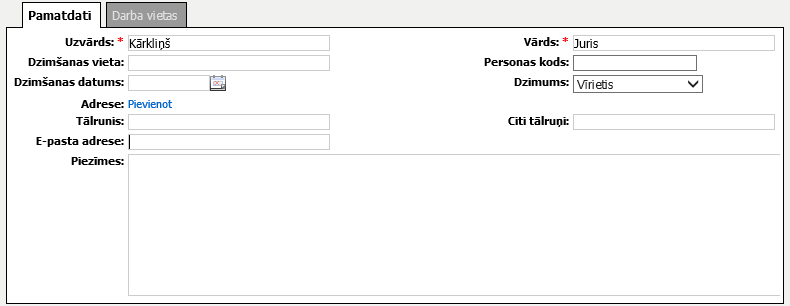 Šķirklis paredzēts fiziskas personas kontaktinformācijas ievadei, labošanai un apskatei.