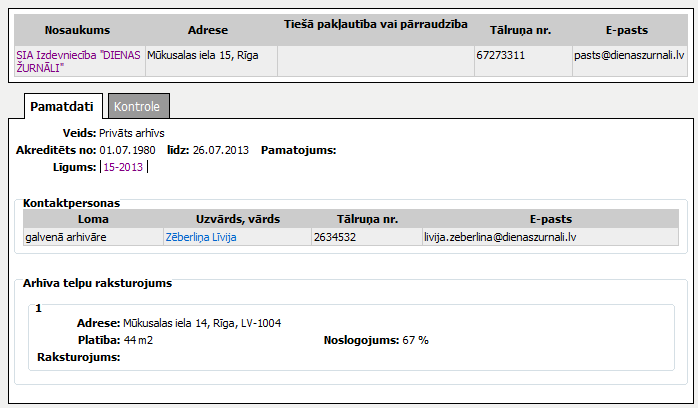 Dati par iestādei atbilstošo Kontaktu modulī reģistrēto institūciju. |