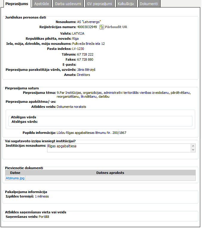Šķirklis „Pieprasījums (par juridisku personu)” paredzēts klienta pieprasījuma par juridisku personu iesnieguma apskatei.