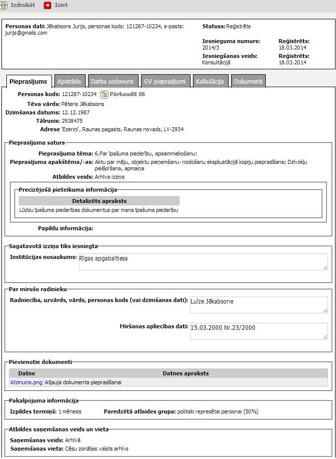 Šķirklis „Pieprasījums (par sevi, par trešo personu)” paredzēts klienta pieprasījuma par sevi vai par trešo personu iesnieguma apskatei.