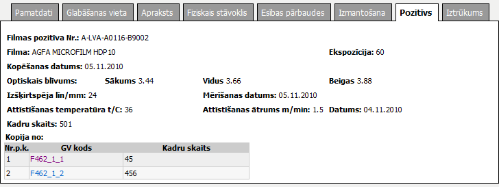 Filmas pozitīva numurs. Lauku attēlo, ja tā vērtība ir norādīta. |