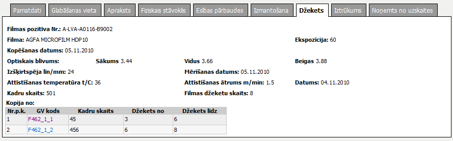 Šķirklis apkopo glabājamās vienības pozitīva vai džeketa informāciju. Ja glabājamā vienība ir pozitīvs, attēlo šķirkli „Pozitīvs”. Ja glabājamā vienība ir džekets, attēlo šķirkli „Džekets”.