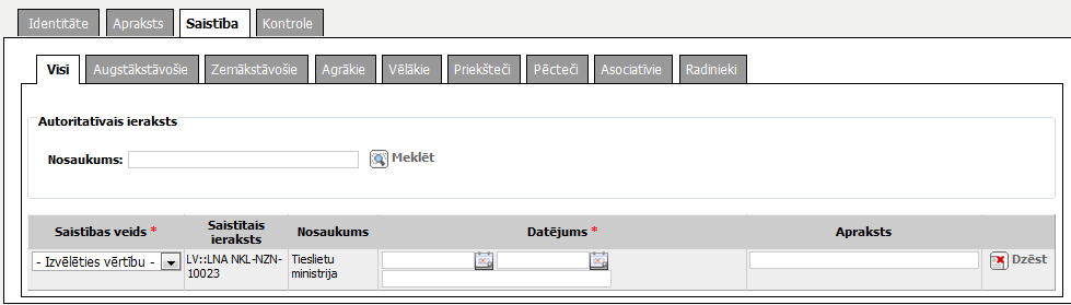 3. Izvēlieties no saraksta sarakstā norādītā autoritatīvā ieraksta saistības veidu attiecībā pret šo autoritatīvo ierakstu. Iespējamās vērtības: Augstākstāvošs, Zemākstāvošs, Agrāks, Vēlāks, Priekštecis, Pēctecis, Asociatīvs, Radinieks.