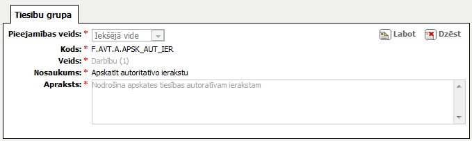 Noklikšķinot tiesību grupas ieraksts tiek dzēsts. Darbība pieejama tām tiesību grupām, kurām nav uzlikta sistēmas pazīme, kas nosaka, tiesību grupa nav dzēšama. |
