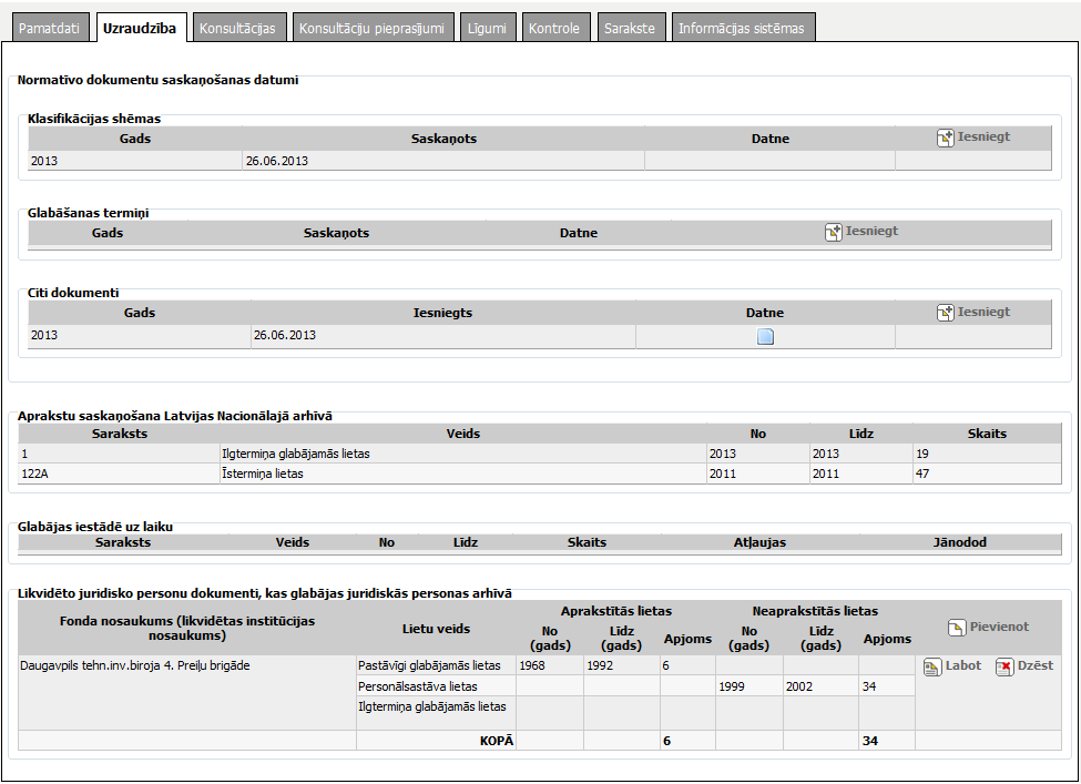 − Likvidēto juridisko personu dokumentu, kas glabājas juridiskās personas arhīvā, informācijas pievienošanai, apskatei, labošanai un dzēšanai.