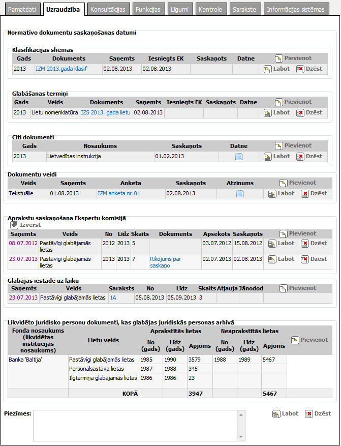 Loga Iestāde šķirklis Uzraudzība paredzēts arhīva uzraugāmās iestādes datu apskatei, labošanai un dzēšanai. Šķirklī tiek parādīta informācija par normatīvo dokumentu saskaņošanu.