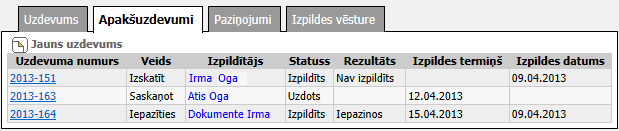 Apakšuzdevuma numurs – kā hipersaite, uz kuras noklikšķinot tiek atvērts uzdevuma logs (skat. aprakstu 27.1 Logs: Uzdevums). |