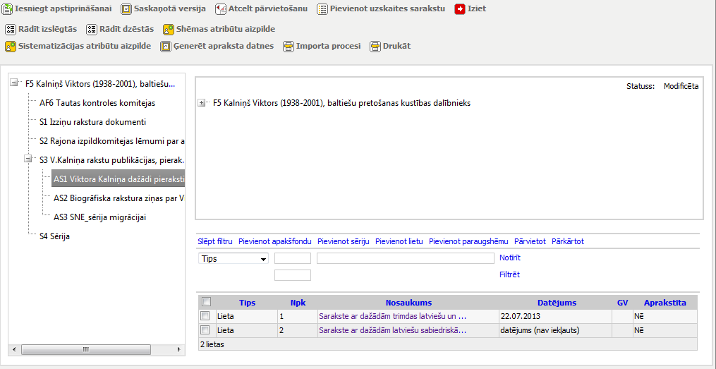 Hierarhiskā veidā attēlo fonda apraksta vienību hierarhiju. Atkarībā no pazīmēm ‘Rādīt izslēgtos’ un ‘Rādīt dzēstos’, tiek attēlotas visas fondam pakārtotās apraksta vienības. Vispirms attēlo fondam piesaistītos apakšfondu, pēc tam secīgi sērijas. Apakšfondam tiek attēlotas tam piesaistītās sērijas. Sērijai attēlo tai piesaistītās apakšsērijas. Par katru apraksta vienību attēlo numuru un nosaukumu. Izvēlētā apraksta vienība tiek attēlota izcelta. Ja apraksta vienībai ir pakārtota apraksta vienība, tiek attēlota izvēršanas un savēršanas darbība. |
