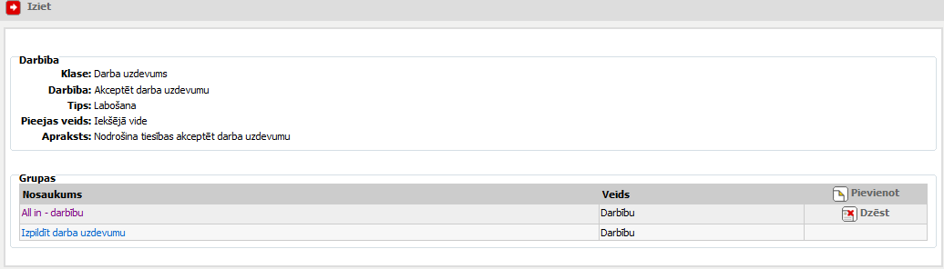 Noklikšķinot tiek atvērts logs darbības iekļaušanai darbību grupā (skat. aprakstu 32.18.1.1Uznirstošais logs: Tiesību grupas pievienošana darbībai). |