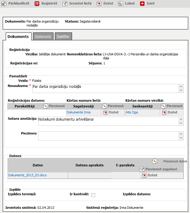 Dokumenta logs satur šķirkļus „Dokuments”, „Uzdevumi”, „Saistītie”.