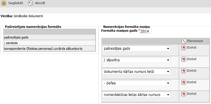 Numerācijas formāts tiek attēlots saraksta veidā, kur katrs ieraksts ir lietvedības dokumenta numura sastāvdaļa. Lietvedības dokumenta numurs tiek veidots secībā, kādā sarakstā norādītas numerācijas sastāvdaļas. Pašreizējā gada numerācijas formāts nav labojams. |