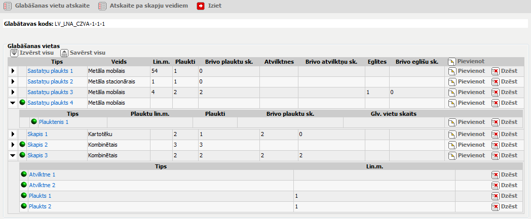 Noklikšķinot sistēma izvērš visu glabātavas glabāšana vietu apakšvienību sarakstu. |