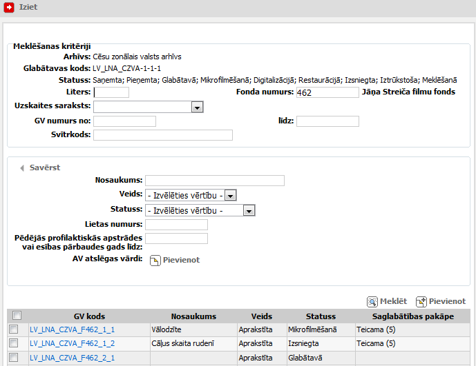 Tabulā attēlo pēc norādītajiem meklēšanas kritērijiem atrastās glabājamās vienības. |