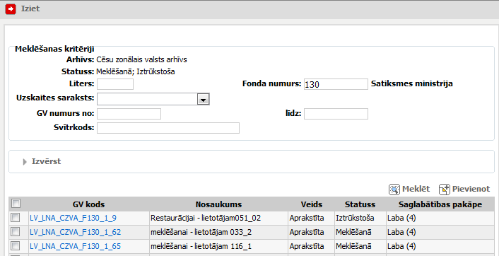 Tabulā attēlo pēc norādītajiem meklēšanas kritērijiem atrastās glabājamās vienības. |