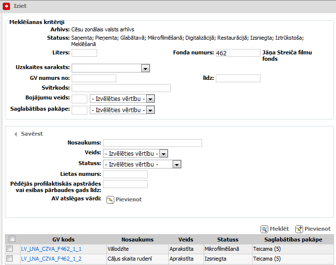 Tabulā attēlo pēc norādītajiem meklēšanas kritērijiem atrastās glabājamās vienības. |