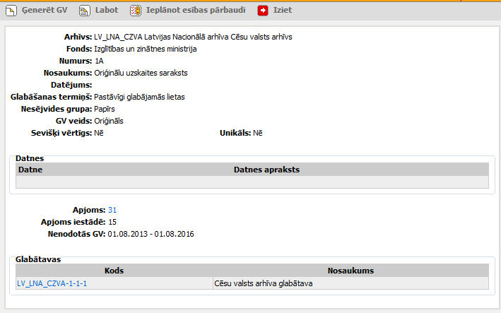 Arhīvs, kam nodod uzskaitītās glabājamās vienības. Lauks pieejamas loga apskates režīmā. |