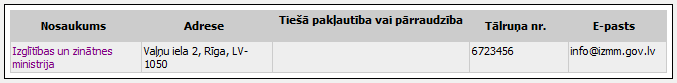Dati par iestādei atbilstošo Kontaktu modulī reģistrēto institūciju (skat. aprakstu 8.1.1 Šķirklis: Pamatdati (uzraudzības iestādei)). |