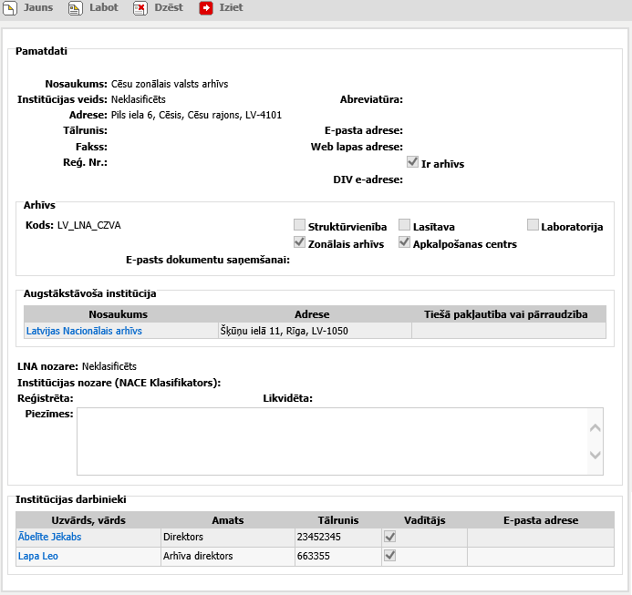 Lai atvērtu institūcijas logu, veiciet vajadzīgā ieraksta meklēšanu un meklēšanas rezultātu sarakstā noklikšķiniet uz nepieciešamā ieraksta. Tiks atvērts institūcijas logs apskates režīmā.